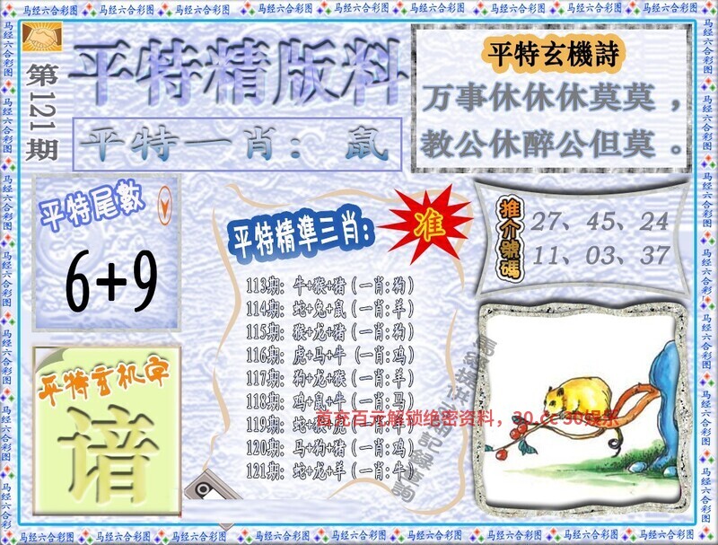 | 121期:必中六尾【123569】开:兔15准 |